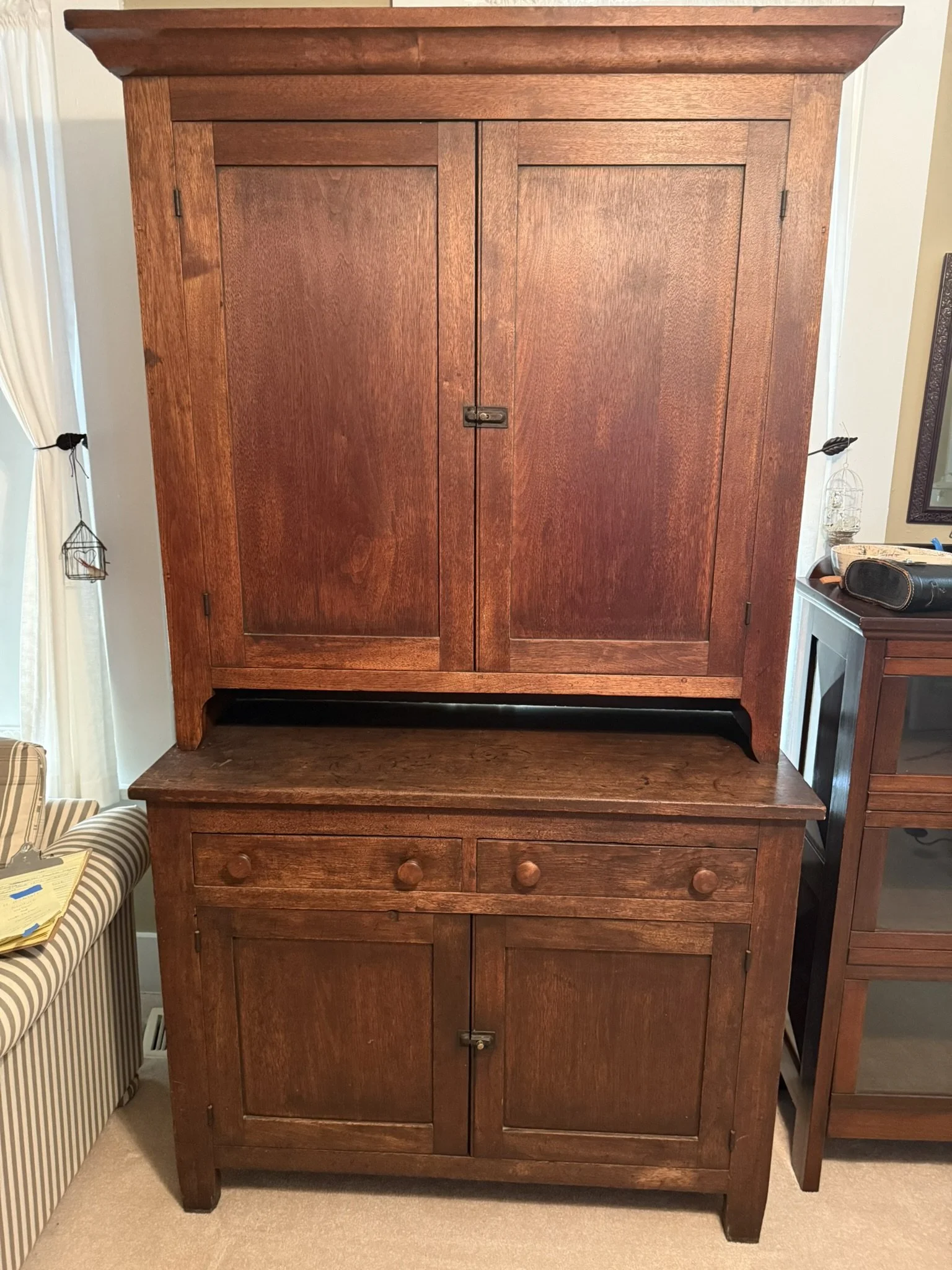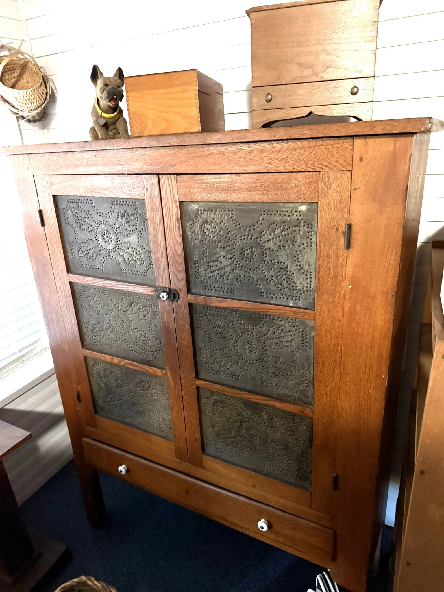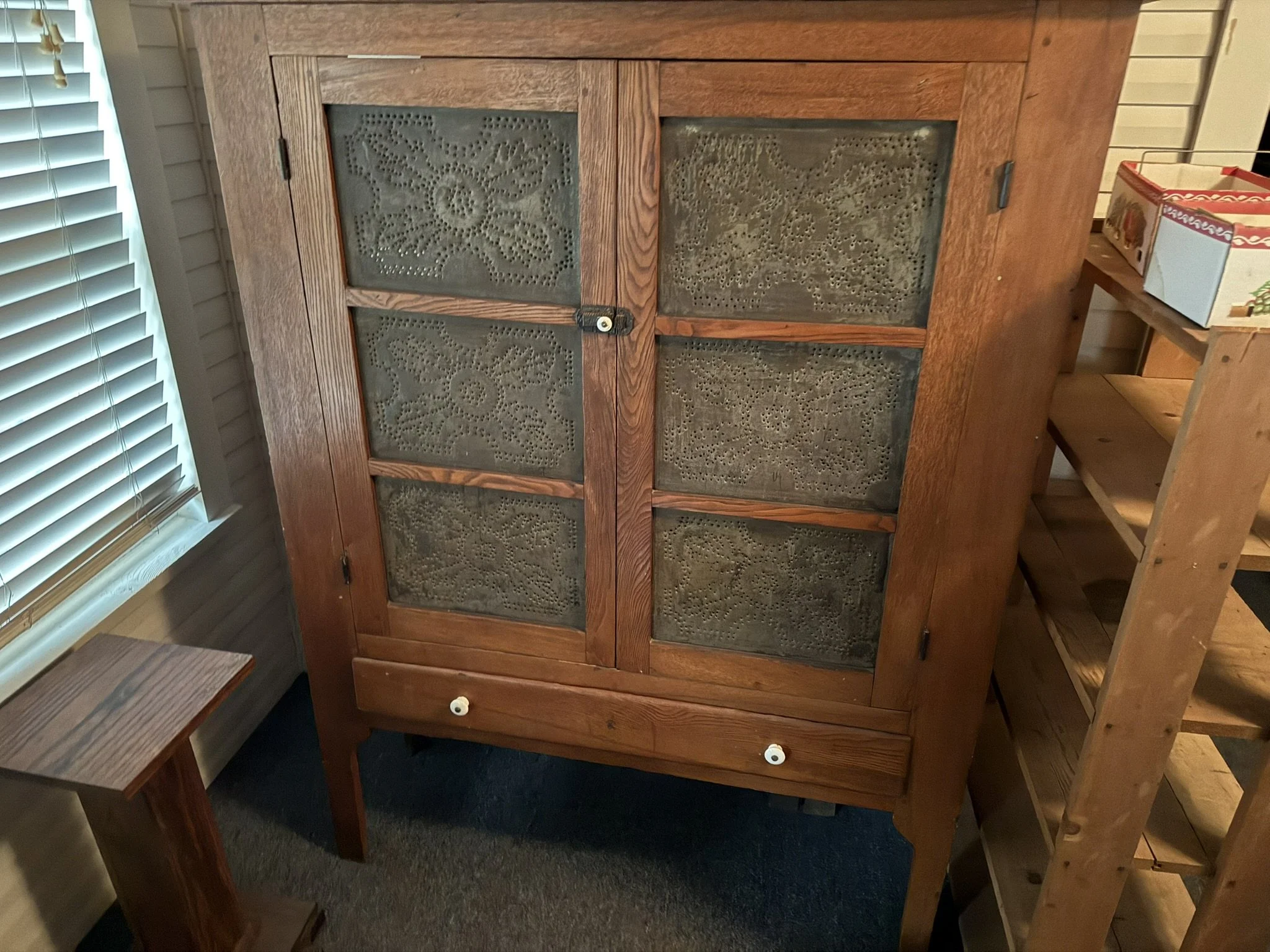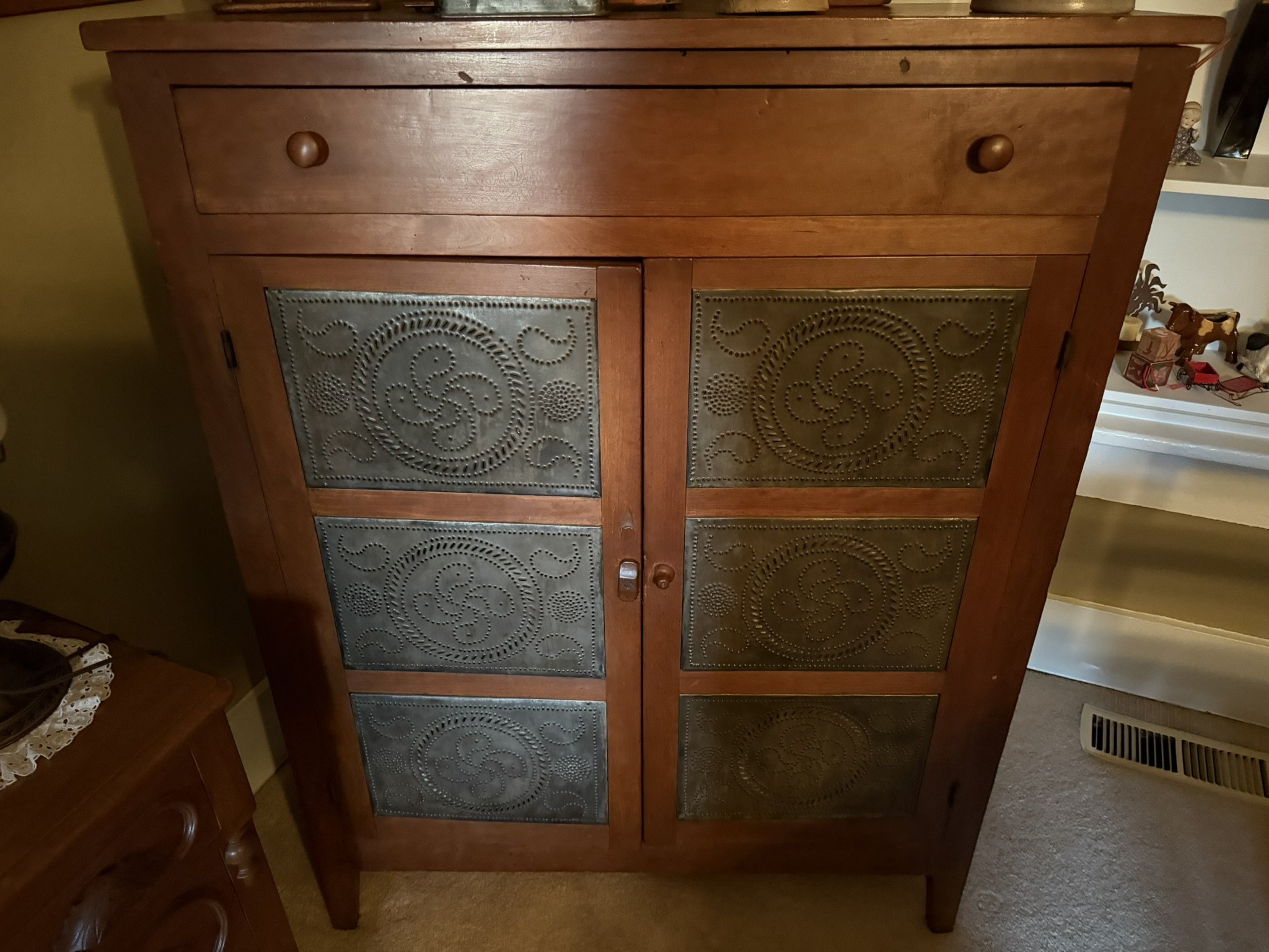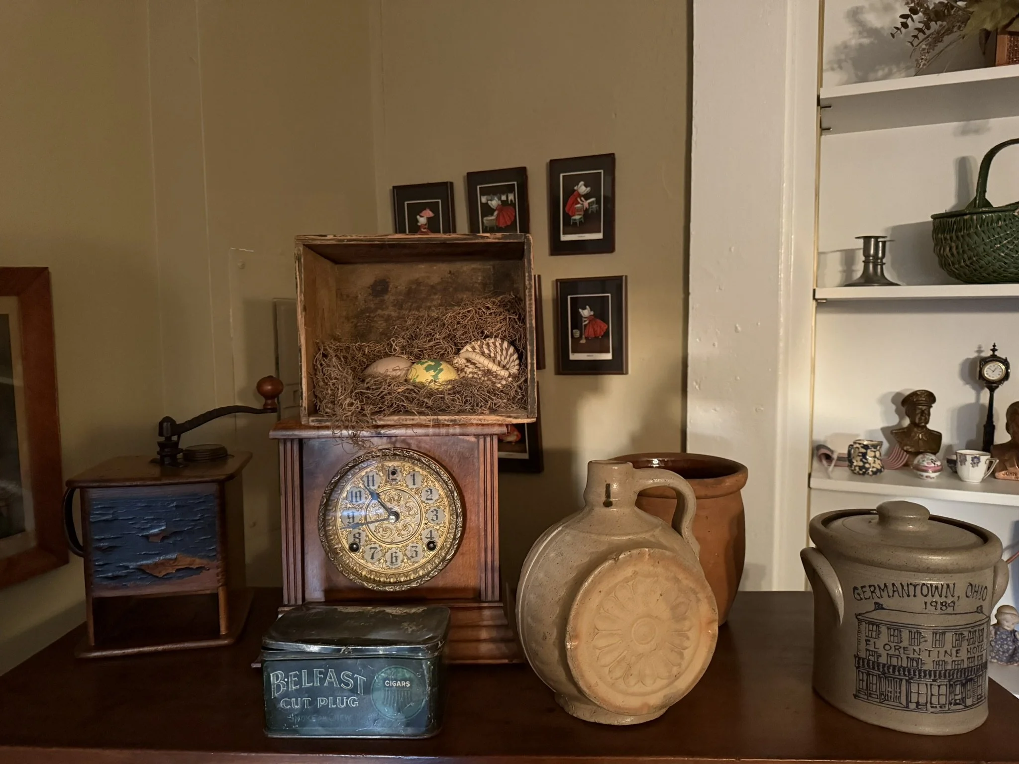 ANTIQUE FURNITURE BY GERMANTOWN CRAFTSMEN and ITEMS OF LOCAL INTEREST: H. Hildabolt Walnut Two Piece Cupboard with Blind Doors, and Paneled Sides - 48½” x 84½”; J.S. Artz Late Empire Walnut Four Drawer Chest of Drawers; Kern Germantown Lion; Peter Lorenz 1840 Throw; Florentine Hotel Pouch-Houck’s Best Mud Lick Whiskey; Florentine Hotel Painting by Susan Kozarek; Miami Military Institute of Ohio Military College 1925 Book Germantown, Ohio; Thirteen Germantown Pretzel Festival Mugs; SIGNATURE PIECE: Hepplewhite Curly Maple Chest with Original Oval Brass Pulls and Four Drawers; ANTIQUE FURNITURE: Corner Cupboard-Twelve Pane with Silverware Drawer and Two Blind Doors on the Bottom, 48”W x 6’6”H; Walnut Plantation Desk with Pidgeon Holes and Burl Front; Cherry One Drawer Over Two Door Twelve Tin Pie Safe; Oak Six Tin Pie Safe with One Drawer at Bottom; Mustard Paint and Green Accents Pie Safe Cabinet with Twelve Star Motif Tins-40 ¾” x 72 ½”; Painted Two Piece Step Back Cupboard-Twelve Pane Top Over Three Drawer Over Two Doors; Poplar Step Back Cupboard; Dry Sink with a Beautiful Aged Patina Showing Layers of Old Color; Gray Painted Dry Sink with One Drawer and Two Doors; Dry Sink with Paneled Doors and Back Splash; Mahogany Three Stack Bookcase with Diamond Pointed Chamfered Sides; Cherry Four Drawer Chest of Drawers with Pillared Sides; Early Red Paint Blanket Chest; Mammies Arrow Back Bench Rocker; Eastlake Maple Spoon Carved Wash Stand with Splash Back and Paneled Sides; Dining Table with Tapered Legs; Walnut Double Gateleg Table; White Wicker Kneehole Desk with Natural Top; Wicker Settee; Walnut Wash Stand with Carved Pulls and Back Splash; Library Table; Bucket Bench; Iron Twin Bed with Brass Trim; Carved Rose Back Rocking Chair with Hip Rests; Four Green Hitchcock Arm Chairs; ANTIQUES: Quilts and Other Textiles; Salesman Child’s Cane Seat Chair; 1938 Drink Coca Cola “Calendar Girl”; Butterscotch Slag Eight Panel Lamp; Sessions Mantle Clock; Stoneware Whiskey Canteen Jug; Sleigh Bells-Graduated with Ten Per Side; CI and Tin Bank Collection-Animals, Clowns, and More; Native American Beaded Purse; Washington D.C. Horse Head Pin; Political Buttons Including Kennedy and Johnson Hologram Buttons; Folk Art Strawberry Butter Mold; Hand school Bell; Maud Humphrey “Days of the Week” Print Series; Floral Oil on Board Still Life; Meakin Ironstone Pitcher and Other Ironstone Pieces; Fiesta Ware; Majolica Etruscan Plate; Green Depression Syrup, Pitcher and Four Tumblers; Rossi Glass Cranberry Vase; Minkler Vase; Griswold and Wagner Skillets; MODERN FURNITURE-HOUSEHOLD: EA Maple Square Dining Table; Four Newer Side Chairs; Two Cushion Couch; White and Grey Striped Loveseat; Rocker/Recliner; Wing Back Chair; White Wicker Six Drawer Dresser and Lingerie Chest; Chaise Lounge; Athens Furniture Colonial Style Tea Cart; Walnut One Drawer Cabinet; GE Upright Freezer; Sharp Flat Screen TV; Eden Pure Heater; Countertop Appliances; Christmas Decorations; Everyday Glassware; Unlisted Items. TERMS: CASH OR PREAPPROVED CHECK. CREDIT CARDS-4% FEE.