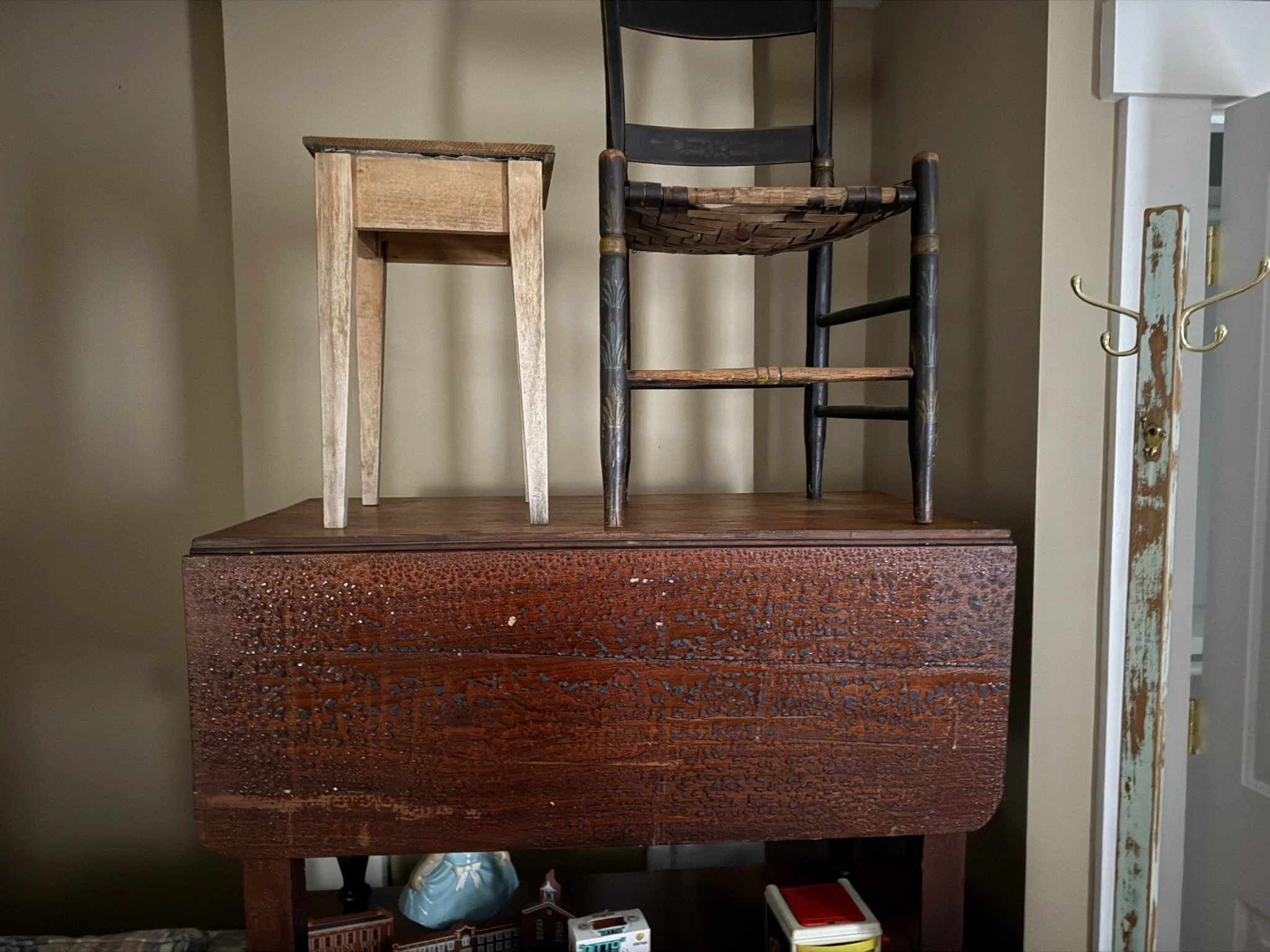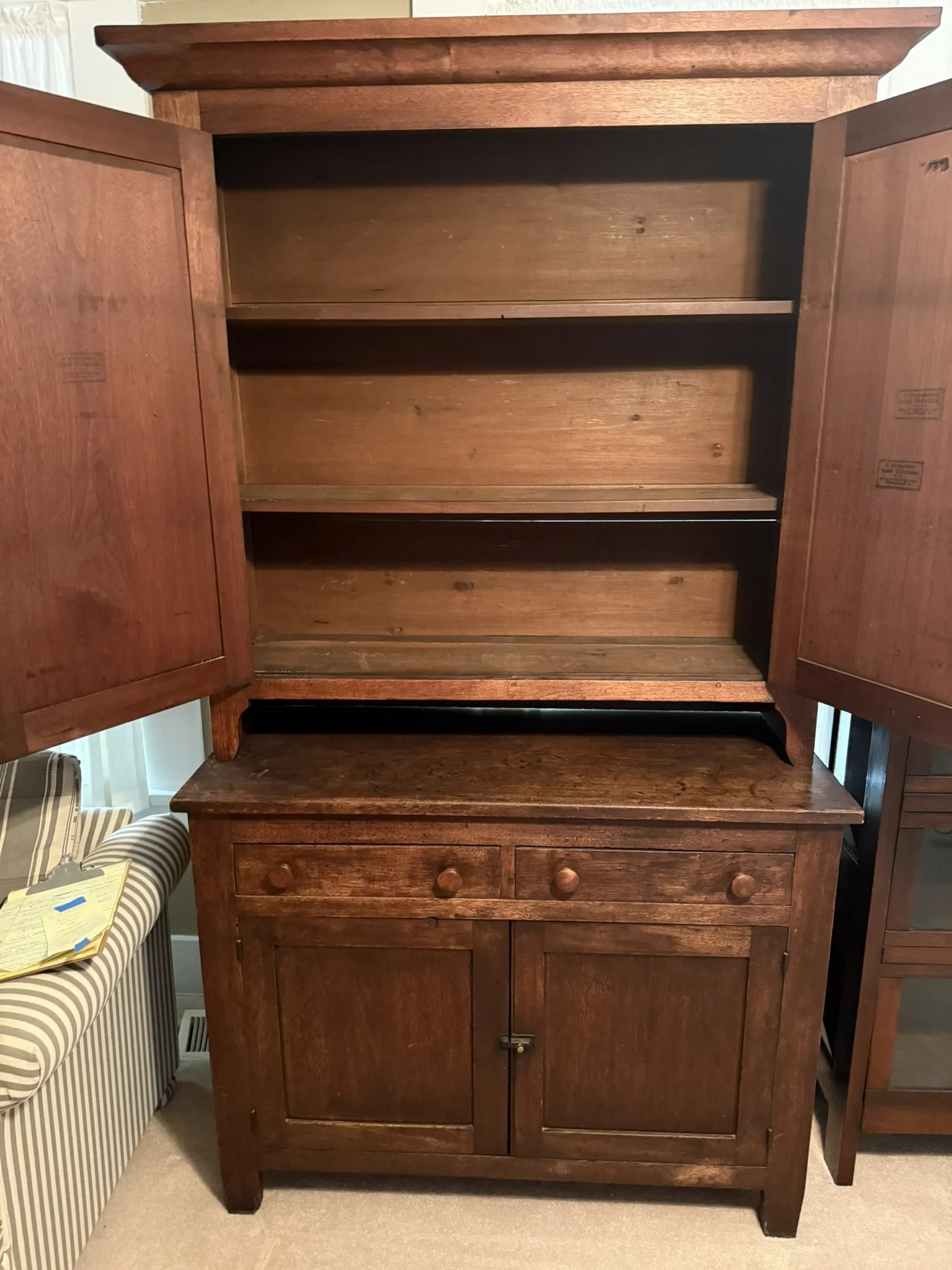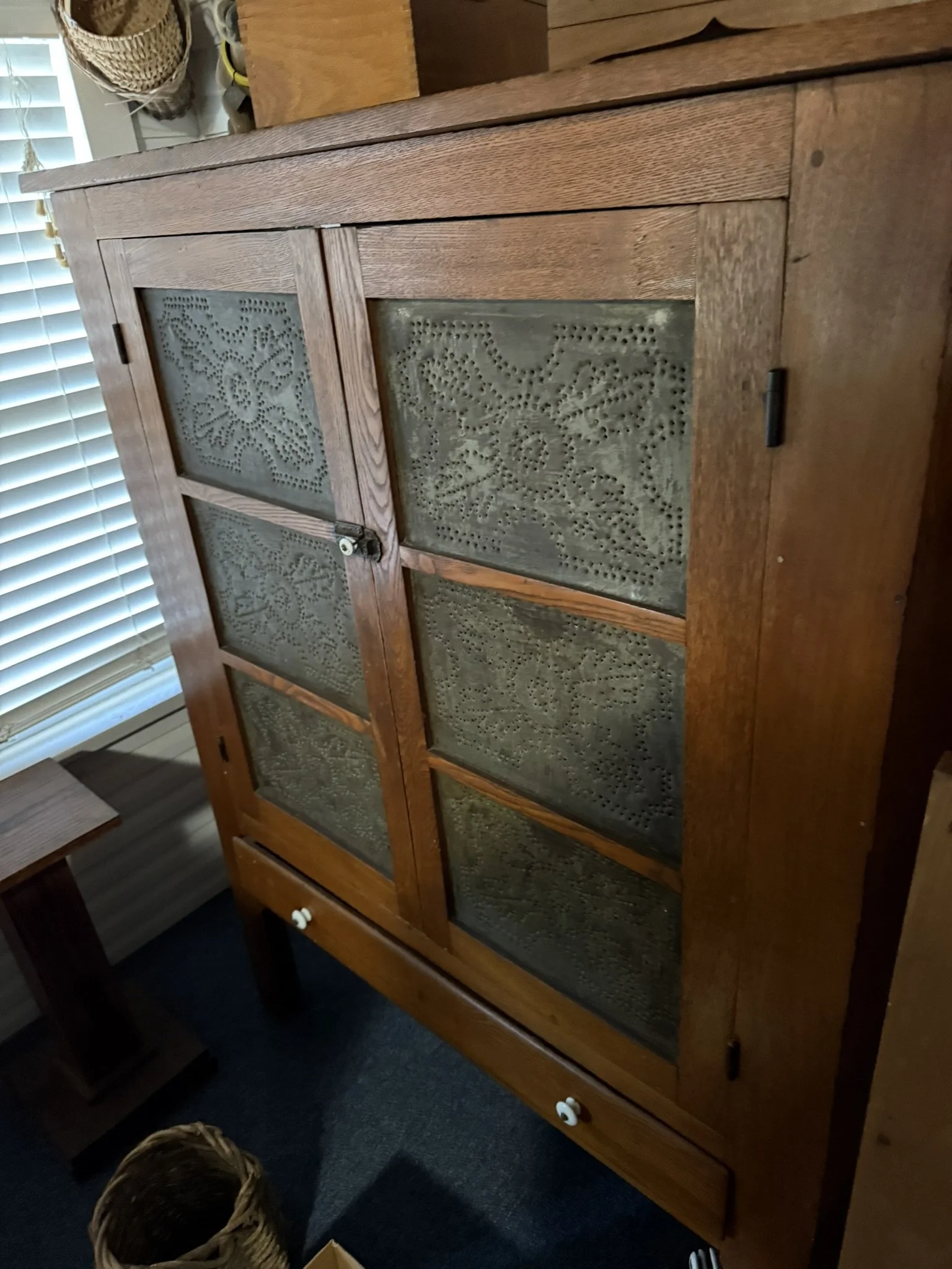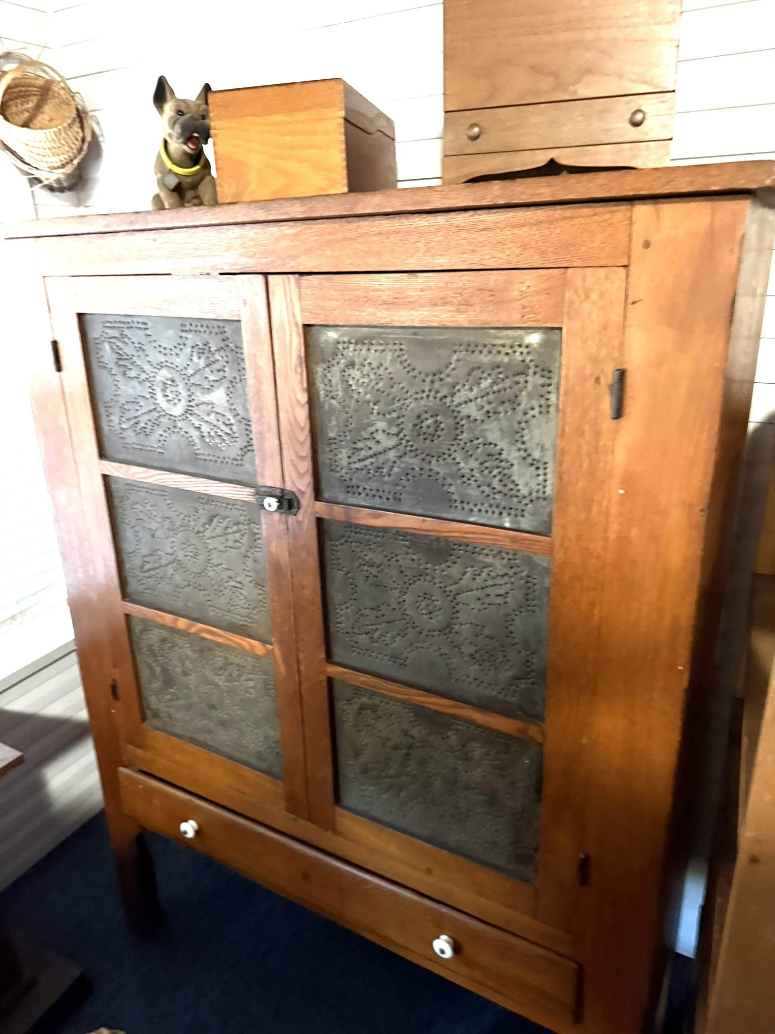 ANTIQUE FURNITURE BY GERMANTOWN CRAFTSMEN and ITEMS OF LOCAL INTEREST: H. Hildabolt Walnut Two Piece Cupboard with Blind Doors, and Paneled Sides - 48½” x 84½”; J.S. Artz Late Empire Walnut Four Drawer Chest of Drawers; Kern Germantown Lion; Peter Lorenz 1840 Throw; Florentine Hotel Pouch-Houck’s Best Mud Lick Whiskey; Florentine Hotel Painting by Susan Kozarek; Miami Military Institute of Ohio Military College 1925 Book Germantown, Ohio; Thirteen Germantown Pretzel Festival Mugs; SIGNATURE PIECE: Hepplewhite Curly Maple Chest with Original Oval Brass Pulls and Four Drawers; ANTIQUE FURNITURE: Corner Cupboard-Twelve Pane with Silverware Drawer and Two Blind Doors on the Bottom, 48”W x 6’6”H; Walnut Plantation Desk with Pidgeon Holes and Burl Front; Cherry One Drawer Over Two Door Twelve Tin Pie Safe; Oak Six Tin Pie Safe with One Drawer at Bottom; Mustard Paint and Green Accents Pie Safe Cabinet with Twelve Star Motif Tins-40 ¾” x 72 ½”; Painted Two Piece Step Back Cupboard-Twelve Pane Top Over Three Drawer Over Two Doors; Poplar Step Back Cupboard; Dry Sink with a Beautiful Aged Patina Showing Layers of Old Color; Gray Painted Dry Sink with One Drawer and Two Doors; Dry Sink with Paneled Doors and Back Splash; Mahogany Three Stack Bookcase with Diamond Pointed Chamfered Sides; Cherry Four Drawer Chest of Drawers with Pillared Sides; Early Red Paint Blanket Chest; Mammies Arrow Back Bench Rocker; Eastlake Maple Spoon Carved Wash Stand with Splash Back and Paneled Sides; Dining Table with Tapered Legs; Walnut Double Gateleg Table; White Wicker Kneehole Desk with Natural Top; Wicker Settee; Walnut Wash Stand with Carved Pulls and Back Splash; Library Table; Bucket Bench; Iron Twin Bed with Brass Trim; Carved Rose Back Rocking Chair with Hip Rests; Four Green Hitchcock Arm Chairs; ANTIQUES: Quilts and Other Textiles; Salesman Child’s Cane Seat Chair; 1938 Drink Coca Cola “Calendar Girl”; Butterscotch Slag Eight Panel Lamp; Sessions Mantle Clock; Stoneware Whiskey Canteen Jug; Sleigh Bells-Graduated with Ten Per Side; CI and Tin Bank Collection-Animals, Clowns, and More; Native American Beaded Purse; Washington D.C. Horse Head Pin; Political Buttons Including Kennedy and Johnson Hologram Buttons; Folk Art Strawberry Butter Mold; Hand school Bell; Maud Humphrey “Days of the Week” Print Series; Floral Oil on Board Still Life; Meakin Ironstone Pitcher and Other Ironstone Pieces; Fiesta Ware; Majolica Etruscan Plate; Green Depression Syrup, Pitcher and Four Tumblers; Rossi Glass Cranberry Vase; Minkler Vase; Griswold and Wagner Skillets; MODERN FURNITURE-HOUSEHOLD: EA Maple Square Dining Table; Four Newer Side Chairs; Two Cushion Couch; White and Grey Striped Loveseat; Rocker/Recliner; Wing Back Chair; White Wicker Six Drawer Dresser and Lingerie Chest; Chaise Lounge; Athens Furniture Colonial Style Tea Cart; Walnut One Drawer Cabinet; GE Upright Freezer; Sharp Flat Screen TV; Eden Pure Heater; Countertop Appliances; Christmas Decorations; Everyday Glassware; Unlisted Items. TERMS: CASH OR PREAPPROVED CHECK. CREDIT CARDS-4% FEE.
