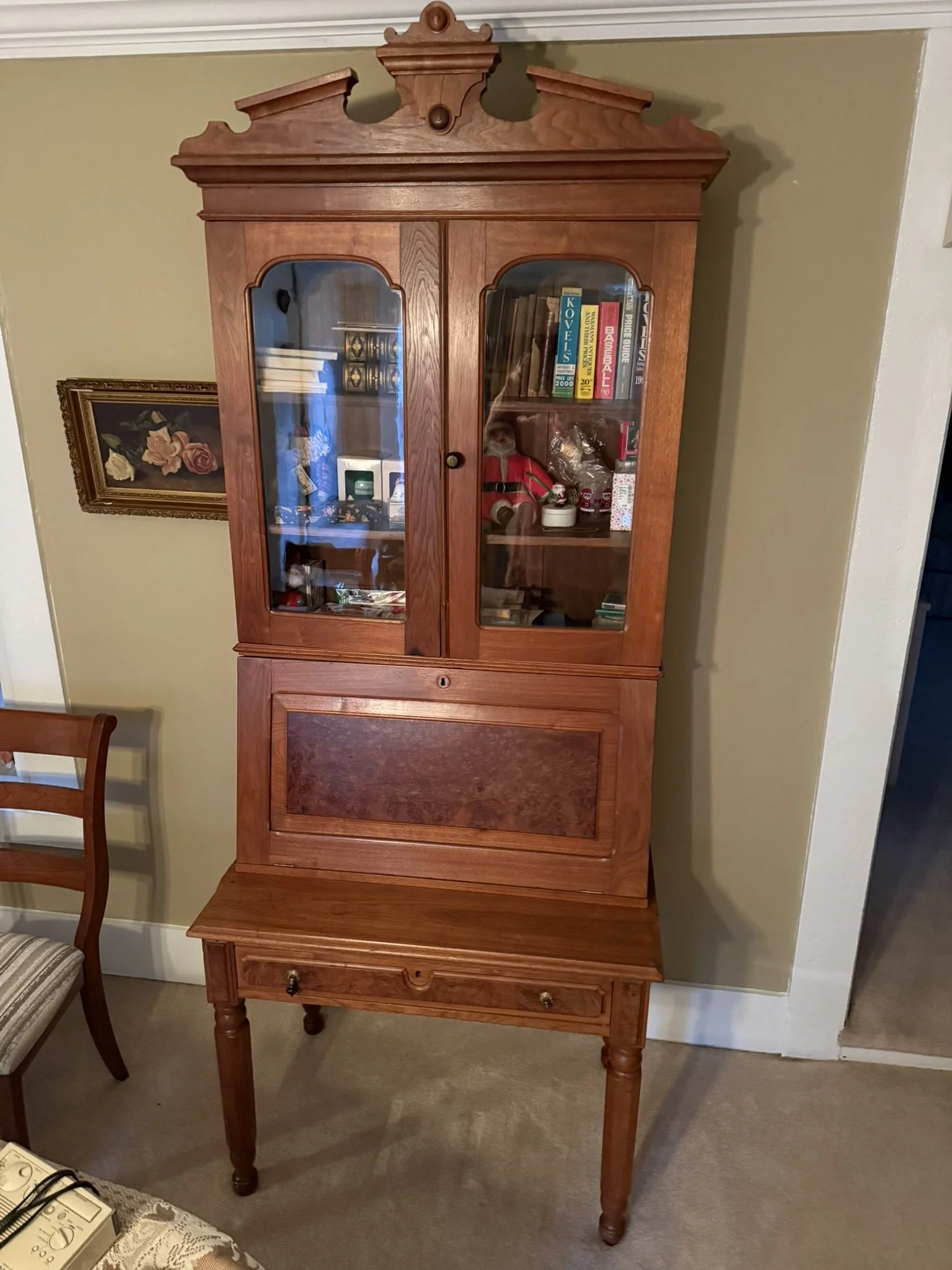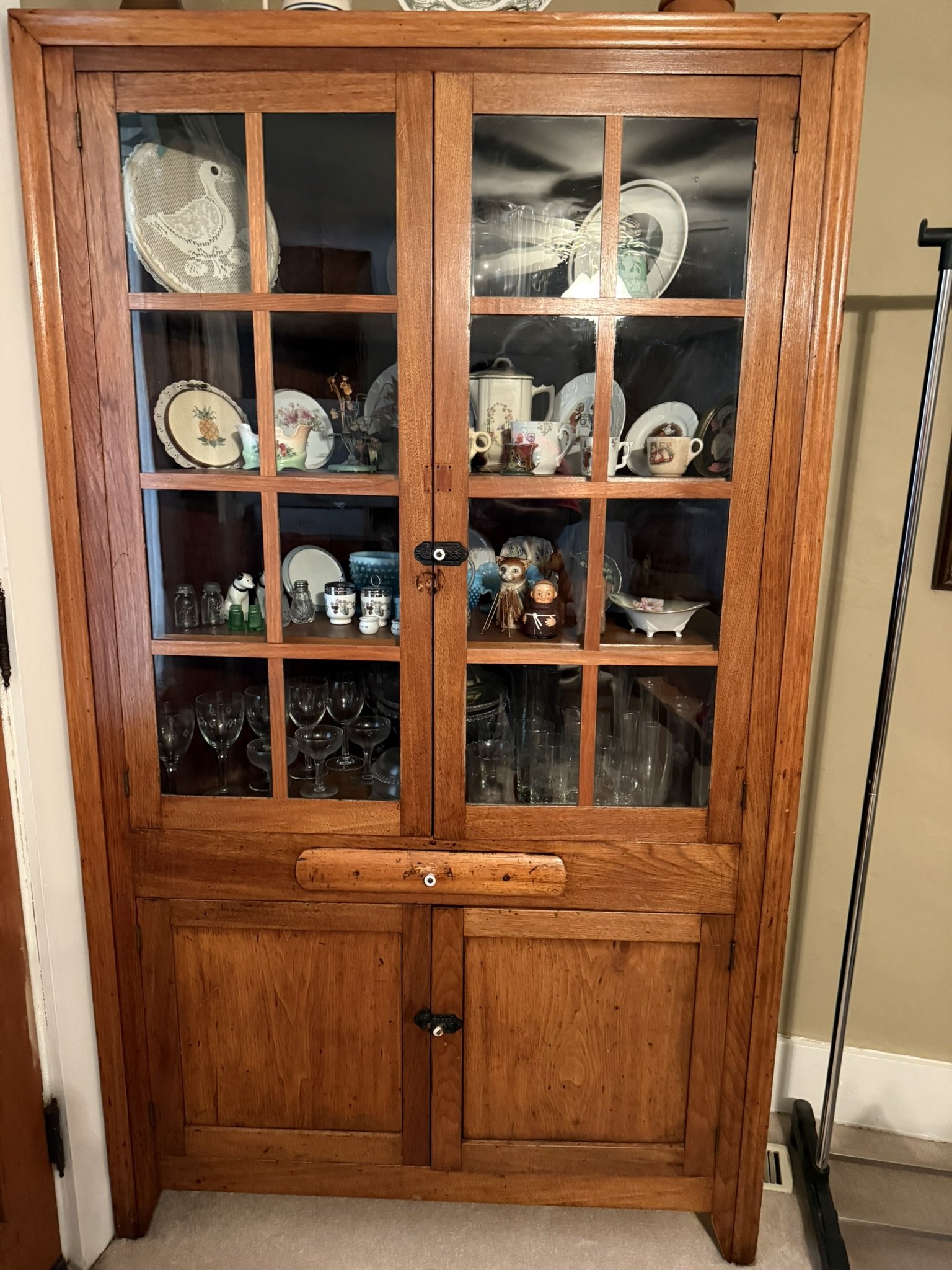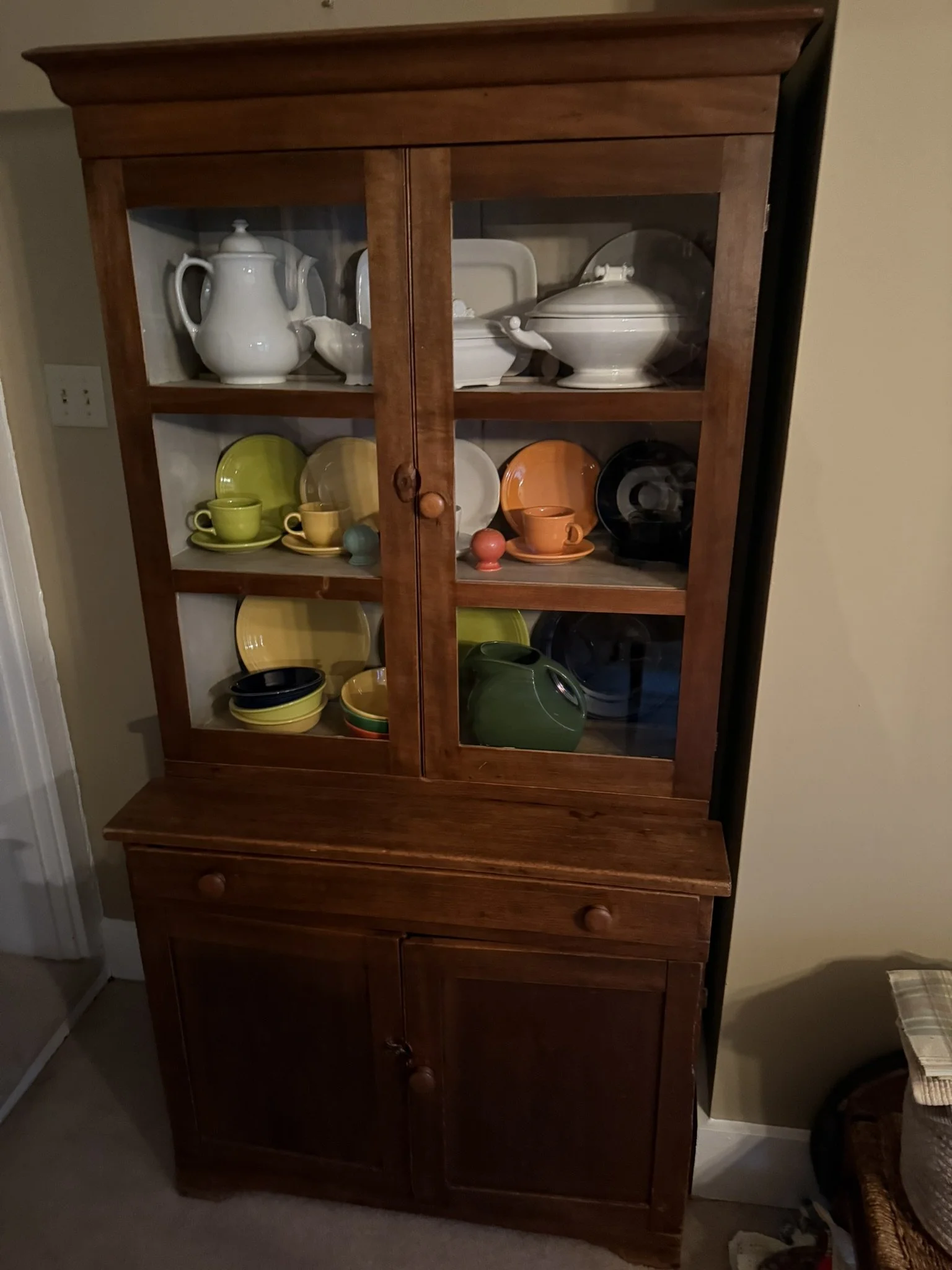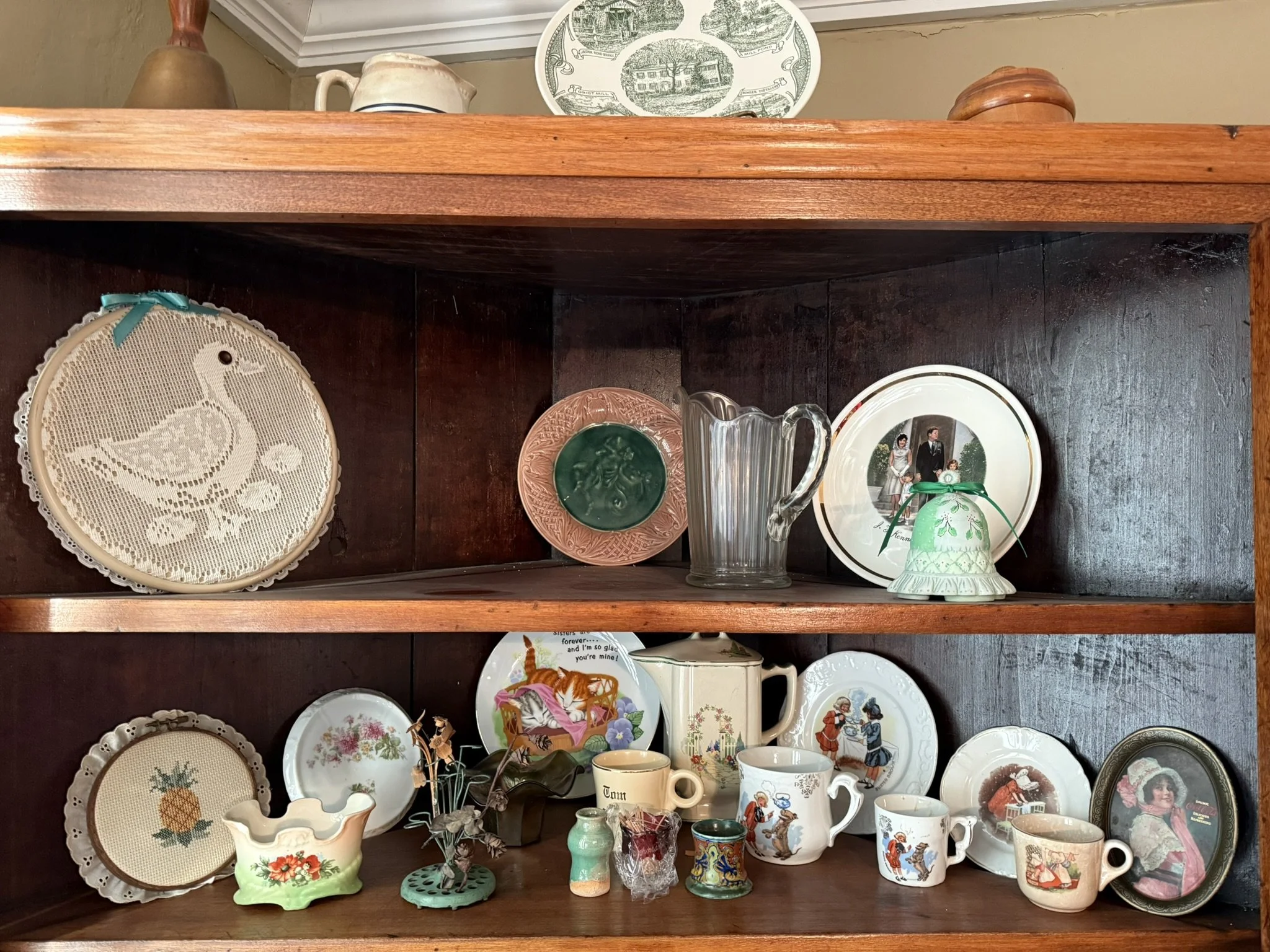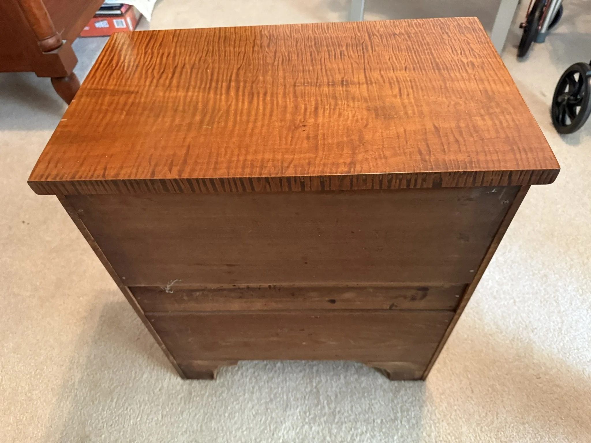 ANTIQUE FURNITURE BY GERMANTOWN CRAFTSMEN and ITEMS OF LOCAL INTEREST: H. Hildabolt Walnut Two Piece Cupboard with Blind Doors, and Paneled Sides - 48½” x 84½”; J.S. Artz Late Empire Walnut Four Drawer Chest of Drawers; Kern Germantown Lion; Peter Lorenz 1840 Throw; Florentine Hotel Pouch-Houck’s Best Mud Lick Whiskey; Florentine Hotel Painting by Susan Kozarek; Miami Military Institute of Ohio Military College 1925 Book Germantown, Ohio; Thirteen Germantown Pretzel Festival Mugs; SIGNATURE PIECE: Hepplewhite Curly Maple Chest with Original Oval Brass Pulls and Four Drawers; ANTIQUE FURNITURE: Corner Cupboard-Twelve Pane with Silverware Drawer and Two Blind Doors on the Bottom, 48”W x 6’6”H; Walnut Plantation Desk with Pidgeon Holes and Burl Front; Cherry One Drawer Over Two Door Twelve Tin Pie Safe; Oak Six Tin Pie Safe with One Drawer at Bottom; Mustard Paint and Green Accents Pie Safe Cabinet with Twelve Star Motif Tins-40 ¾” x 72 ½”; Painted Two Piece Step Back Cupboard-Twelve Pane Top Over Three Drawer Over Two Doors; Poplar Step Back Cupboard; Dry Sink with a Beautiful Aged Patina Showing Layers of Old Color; Gray Painted Dry Sink with One Drawer and Two Doors; Dry Sink with Paneled Doors and Back Splash; Mahogany Three Stack Bookcase with Diamond Pointed Chamfered Sides; Cherry Four Drawer Chest of Drawers with Pillared Sides; Early Red Paint Blanket Chest; Mammies Arrow Back Bench Rocker; Eastlake Maple Spoon Carved Wash Stand with Splash Back and Paneled Sides; Dining Table with Tapered Legs; Walnut Double Gateleg Table; White Wicker Kneehole Desk with Natural Top; Wicker Settee; Walnut Wash Stand with Carved Pulls and Back Splash; Library Table; Bucket Bench; Iron Twin Bed with Brass Trim; Carved Rose Back Rocking Chair with Hip Rests; Four Green Hitchcock Arm Chairs; ANTIQUES: Quilts and Other Textiles; Salesman Child’s Cane Seat Chair; 1938 Drink Coca Cola “Calendar Girl”; Butterscotch Slag Eight Panel Lamp; Sessions Mantle Clock; Stoneware Whiskey Canteen Jug; Sleigh Bells-Graduated with Ten Per Side; CI and Tin Bank Collection-Animals, Clowns, and More; Native American Beaded Purse; Washington D.C. Horse Head Pin; Political Buttons Including Kennedy and Johnson Hologram Buttons; Folk Art Strawberry Butter Mold; Hand school Bell; Maud Humphrey “Days of the Week” Print Series; Floral Oil on Board Still Life; Meakin Ironstone Pitcher and Other Ironstone Pieces; Fiesta Ware; Majolica Etruscan Plate; Green Depression Syrup, Pitcher and Four Tumblers; Rossi Glass Cranberry Vase; Minkler Vase; Griswold and Wagner Skillets; MODERN FURNITURE-HOUSEHOLD: EA Maple Square Dining Table; Four Newer Side Chairs; Two Cushion Couch; White and Grey Striped Loveseat; Rocker/Recliner; Wing Back Chair; White Wicker Six Drawer Dresser and Lingerie Chest; Chaise Lounge; Athens Furniture Colonial Style Tea Cart; Walnut One Drawer Cabinet; GE Upright Freezer; Sharp Flat Screen TV; Eden Pure Heater; Countertop Appliances; Christmas Decorations; Everyday Glassware; Unlisted Items. TERMS: CASH OR PREAPPROVED CHECK. CREDIT CARDS-4% FEE.