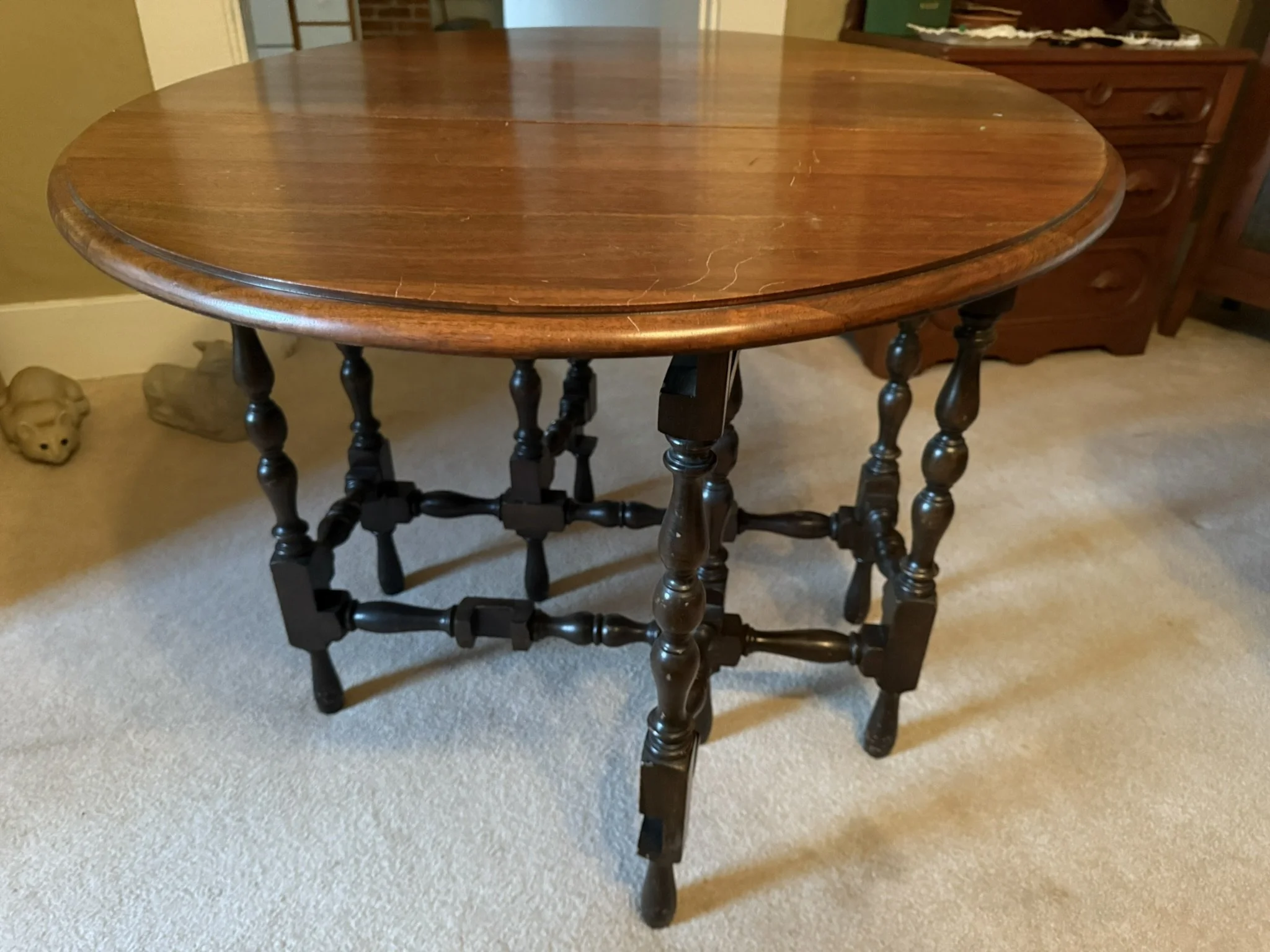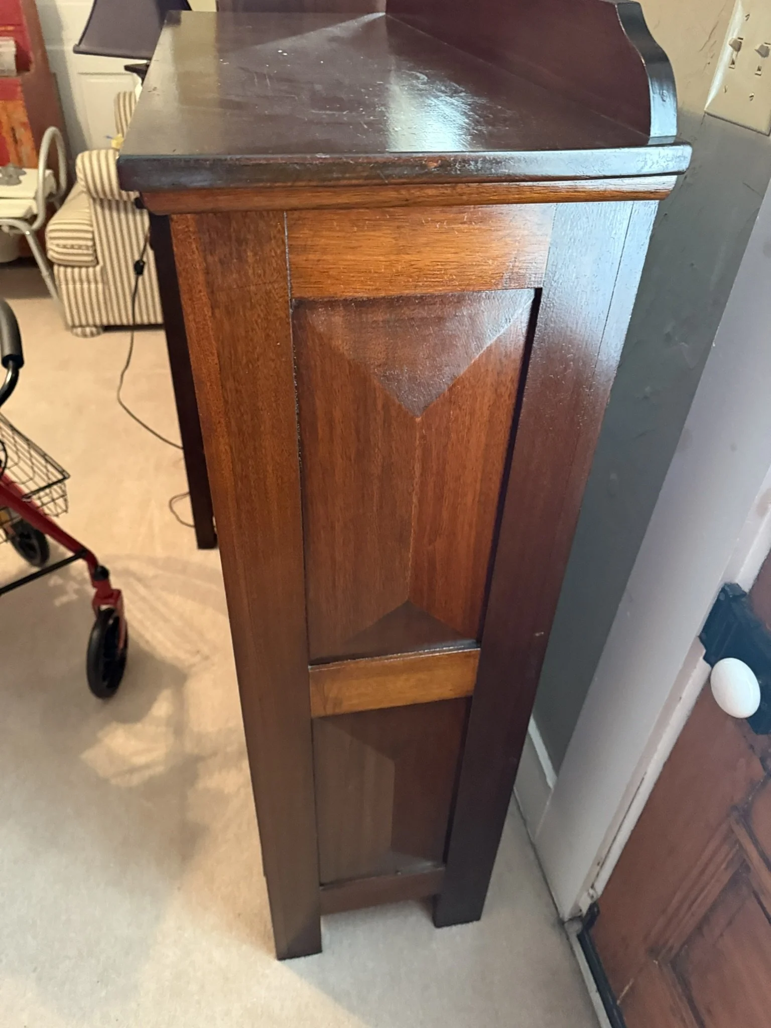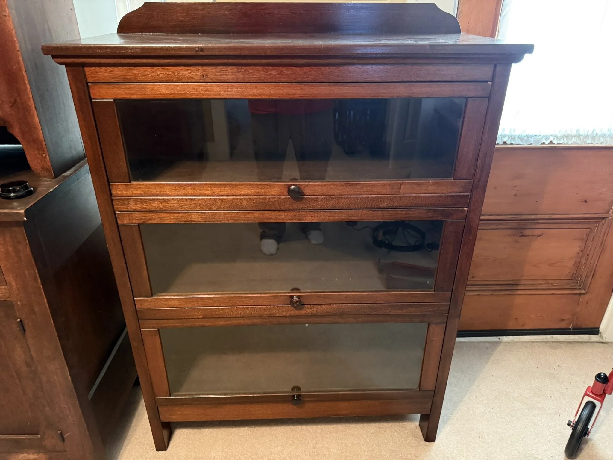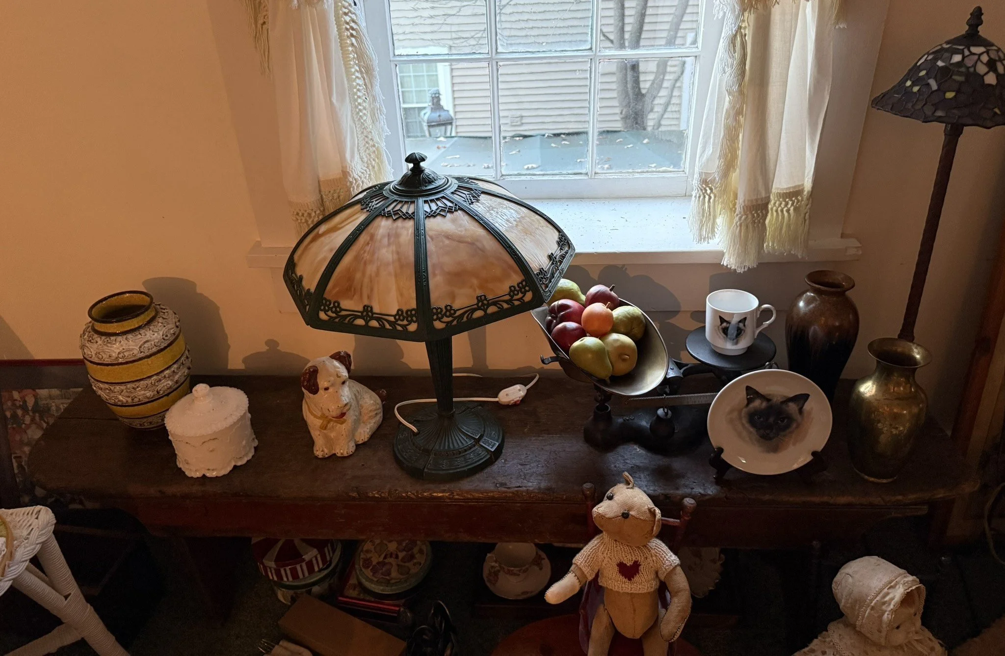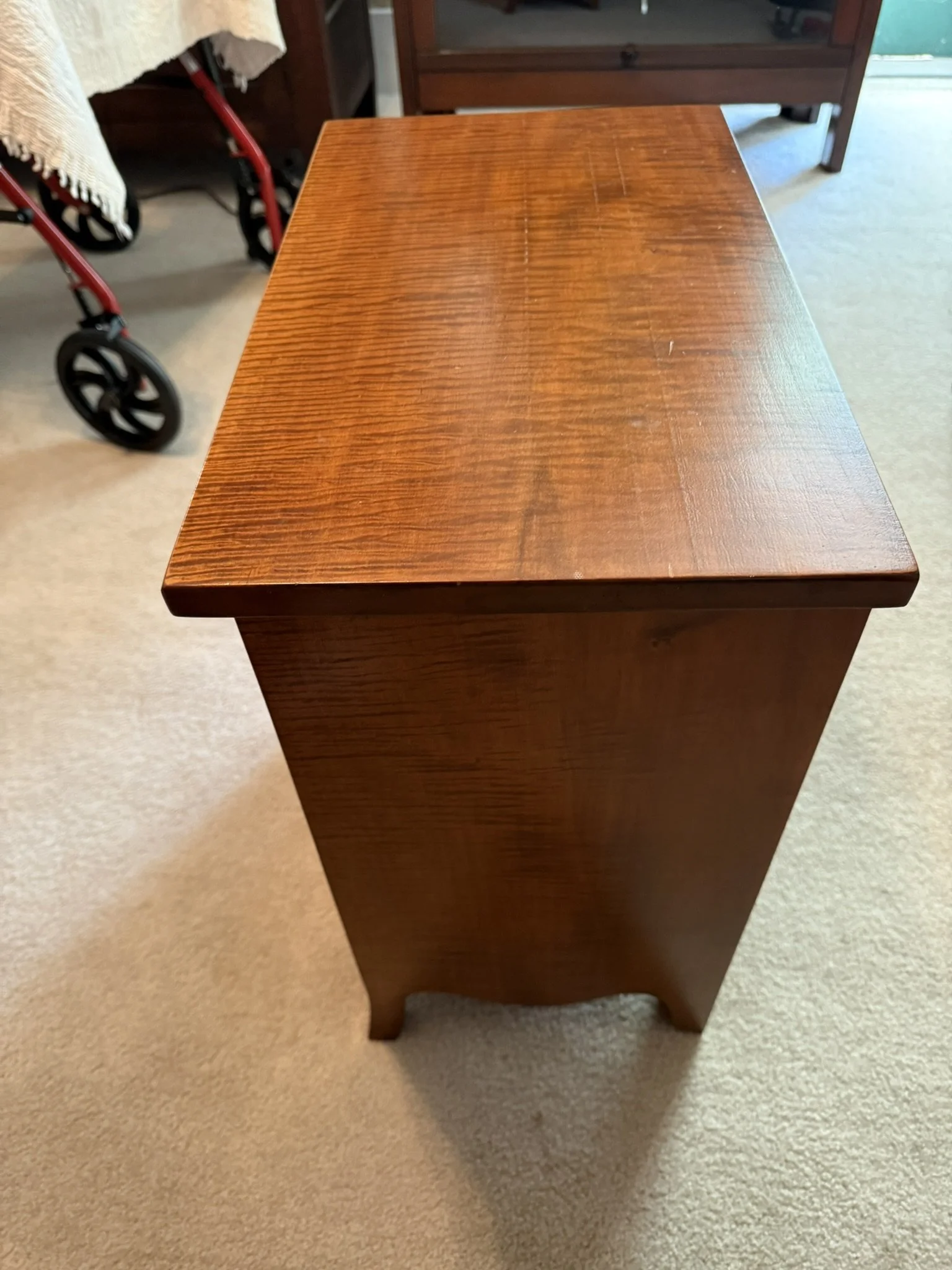 ANTIQUE FURNITURE BY GERMANTOWN CRAFTSMEN and ITEMS OF LOCAL INTEREST: H. Hildabolt Walnut Two Piece Cupboard with Blind Doors, and Paneled Sides - 48½” x 84½”; J.S. Artz Late Empire Walnut Four Drawer Chest of Drawers; Kern Germantown Lion; Peter Lorenz 1840 Throw; Florentine Hotel Pouch-Houck’s Best Mud Lick Whiskey; Florentine Hotel Painting by Susan Kozarek; Miami Military Institute of Ohio Military College 1925 Book Germantown, Ohio; Thirteen Germantown Pretzel Festival Mugs; SIGNATURE PIECE: Hepplewhite Curly Maple Chest with Original Oval Brass Pulls and Four Drawers; ANTIQUE FURNITURE: Corner Cupboard-Twelve Pane with Silverware Drawer and Two Blind Doors on the Bottom, 48”W x 6’6”H; Walnut Plantation Desk with Pidgeon Holes and Burl Front; Cherry One Drawer Over Two Door Twelve Tin Pie Safe; Oak Six Tin Pie Safe with One Drawer at Bottom; Mustard Paint and Green Accents Pie Safe Cabinet with Twelve Star Motif Tins-40 ¾” x 72 ½”; Painted Two Piece Step Back Cupboard-Twelve Pane Top Over Three Drawer Over Two Doors; Poplar Step Back Cupboard; Dry Sink with a Beautiful Aged Patina Showing Layers of Old Color; Gray Painted Dry Sink with One Drawer and Two Doors; Dry Sink with Paneled Doors and Back Splash; Mahogany Three Stack Bookcase with Diamond Pointed Chamfered Sides; Cherry Four Drawer Chest of Drawers with Pillared Sides; Early Red Paint Blanket Chest; Mammies Arrow Back Bench Rocker; Eastlake Maple Spoon Carved Wash Stand with Splash Back and Paneled Sides; Dining Table with Tapered Legs; Walnut Double Gateleg Table; White Wicker Kneehole Desk with Natural Top; Wicker Settee; Walnut Wash Stand with Carved Pulls and Back Splash; Library Table; Bucket Bench; Iron Twin Bed with Brass Trim; Carved Rose Back Rocking Chair with Hip Rests; Four Green Hitchcock Arm Chairs; ANTIQUES: Quilts and Other Textiles; Salesman Child’s Cane Seat Chair; 1938 Drink Coca Cola “Calendar Girl”; Butterscotch Slag Eight Panel Lamp; Sessions Mantle Clock; Stoneware Whiskey Canteen Jug; Sleigh Bells-Graduated with Ten Per Side; CI and Tin Bank Collection-Animals, Clowns, and More; Native American Beaded Purse; Washington D.C. Horse Head Pin; Political Buttons Including Kennedy and Johnson Hologram Buttons; Folk Art Strawberry Butter Mold; Hand school Bell; Maud Humphrey “Days of the Week” Print Series; Floral Oil on Board Still Life; Meakin Ironstone Pitcher and Other Ironstone Pieces; Fiesta Ware; Majolica Etruscan Plate; Green Depression Syrup, Pitcher and Four Tumblers; Rossi Glass Cranberry Vase; Minkler Vase; Griswold and Wagner Skillets; MODERN FURNITURE-HOUSEHOLD: EA Maple Square Dining Table; Four Newer Side Chairs; Two Cushion Couch; White and Grey Striped Loveseat; Rocker/Recliner; Wing Back Chair; White Wicker Six Drawer Dresser and Lingerie Chest; Chaise Lounge; Athens Furniture Colonial Style Tea Cart; Walnut One Drawer Cabinet; GE Upright Freezer; Sharp Flat Screen TV; Eden Pure Heater; Countertop Appliances; Christmas Decorations; Everyday Glassware; Unlisted Items. TERMS: CASH OR PREAPPROVED CHECK. CREDIT CARDS-4% FEE.