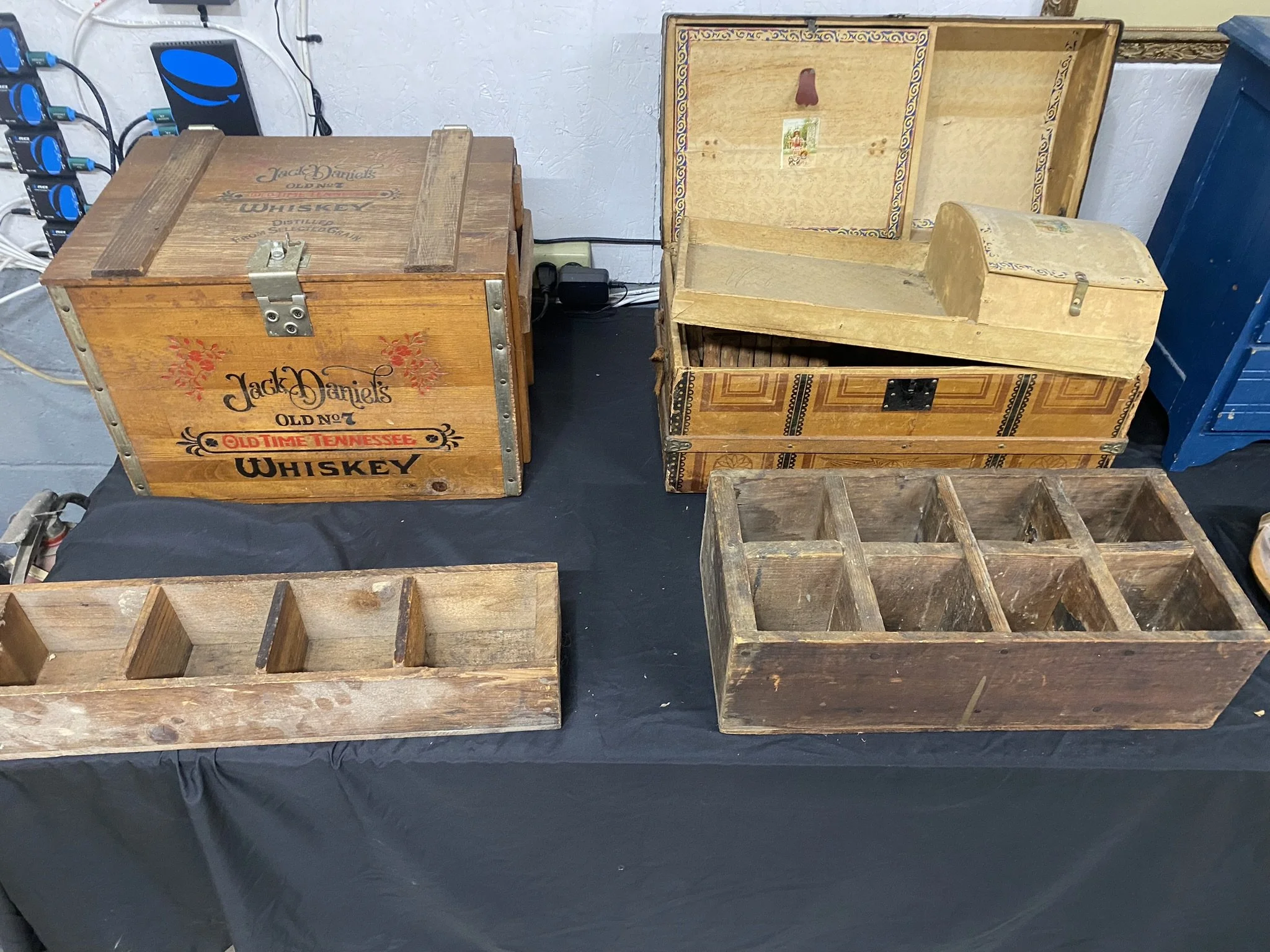 FURNITURE: Dry Sink with Copper Insert and Porcelain Pulls; Oak 38 Two Open Drawer School Cabinet; Oak Sellers Type Cabinet with Porcelain Top and Flour Bin; Two Door Jelly Cupboard; Oak Curved Glass Mirror Back China Cabinet; Oak Wash Stand with Towel Bar; Two Primitive Painted Upright One Door Cabinets; Green Upright Two Door Cabinet; Several Stands; ANTIQUES-COLLECTIBLES: Shaker Slat Basket with Wire Bale and Wood Handle; Salesman’s Sample Dome Top Trunk; 1920s Slatted Wood Shopping Cart; Miniature Three Drawer Chest; Violin; Ingraham Mantle Clock; Butterscotch Slag Four Panel Lamp Shade; GWTW Type Lamps; Floor Lamps; Electrified Oil Lamps; Sunbeam Turquoise Mixmaster Mixer; Wooden Bowls; Dayton Ohio Spice Tins; Sugar Bucket; Wooden Bucket; Blue Salt Glaze Pitchers; Blue Crock Type Bowls and Casseroles; Crocks and Jugs; Sealing Wax Crock Jars; Miniature Crocks and Jugs; Composition Doll; Chenille Bed Spreads; Black Americana; Wooden Kitchen Utensils; Several Yardlongs; Tonnesson Sisters Framed Photo Prints; Dog and Children Framed Prints; Lots Of Framed Pictures; Variety Baskets; Newer Five Piece Miniature Cast Iron Cookware Set; Fiesta Five Piece Silicone Measuring Bowl Set; Marbles; Jack Daniels’s Whiskey Crate; Flamingo and Pelican Figurines; Wall Pockets; Eight Tracks; Vintage Christmas Décor; GLASSWARE-CHINA: Hutschenreuther Eight Place Setting Dinnerware Noritake Gloria Six Place Setting Dinnerware; Christmas Wreath and Tree Dinnerware; Corelle Ware Snowflake Blue Garland Sixteen Place Setting Dinnerware; Ironstone Tureen and Underplate; Cheese Saver; Ringtons Blue Willow Porcelain Tea Caddy; Yellow Ware Mixing Bowl; Pitcher and Bowl; Majolica Pitcher and Others; Lots of Vintage Fireking and Pyrex; Jadeite Batter Bowl; Tulip Five Piece Canister Set; Shawnee Cat and Puss and Boots Cookie Jars with S& P’s; Cookie Jars; Hall Jewel Tea Stacking Casserole Set; Watt Ware Apple Pattern Thirteen Pieces-Bowls and Pitchers; and Other Corning Ware; Condiment Set with Plated Castor Nice Asst. Clear Glass; Dutch Windmill Spice Rack Set; Wall Pockets; Twenty Four Paper Weights; S&P Sets; Sellers Type Jars; TERMS: CASH OR PRE-APPROVED CHECK. Sales Tax Applicable.